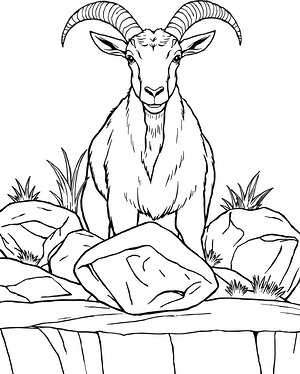 Curved horns sweep backward from the goat's head in smooth arcs, while a distinctive beard hangs from its chin above a sturdy neck in this printable coloring page. The rocky ledge beneath features multiple stone shapes with jagged edges and surface cracks that create varied geometric forms. Scattered grass tufts with blade-like leaves grow between the rocks, adding organic patterns to contrast the hard stone surfaces. The goat's textured coat needs short, directional strokes to show fur growth patterns across its body and legs. Try warm browns or grays for the rocks with darker shading in the crevices, while the grass tufts might use yellow-greens or dried tan shades. The horns could take bone-white or charcoal tones with gradual shading along their curves to show dimension.