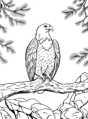 Powerful talons wrap around a thick tree limb showing deep grooves and knots in the wood grain on this coloring sheet. The eagle's wing feathers display individual plume sections with distinct separation lines, while head feathers have a smoother texture that contrasts with the rougher body plumage. Rocky formations behind the bird feature sharp-edged cracks and layered stone surfaces, creating depth against clusters of pine needles radiating from their branch attachments. Different textures throughout this printable need varied shading approaches-smooth pencil strokes for the eagle's white head feathers versus crosshatching for darker wing sections. The bark's grooves benefit from deep shadows between raised portions, while pine needles suit single directional strokes that follow their length. Try mixing warm browns and grays for the branch, keeping rock faces in cooler stone tones to separate the background elements.