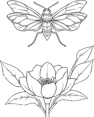 Symmetrical wing patterns on the moth create mirror-image sections ready for different shading approaches on each side. The flower beneath features overlapping petals that radiate outward in curved layers, while textured veining runs through the two prominent leaves at the base. Each wing segment contains eye-spot markings and geometric divisions that break up the moth's body into manageable coloring zones. The moth's wing segments need careful attention to light and dark values to bring out the natural pattern contrasts found in luna moths or cecropia species. Petals might use gradient techniques moving from deep centers outward to pale tips, while the leaf veins benefit from darker pencil work against lighter green backgrounds. Try warm yellows and creams for the moth paired with cool purples or pinks in the bloom for striking contrast.