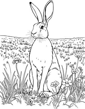 A watchful hare sits centered among meadow blooms, its long ears pointing skyward and fur marked with flowing line patterns that follow the body's contours in this coloring page. Daisy-like flowers with rounded petals mix with smaller clustered blooms, while individual grass blades cross at varying angles across the scene. The hare's face shows alert features with distinct whisker marks and large eyes that provide focal points for detail work. The fur texture needs careful shading with pencil strokes that match the line direction, creating realistic depth across the body and ears. Try warm browns, soft grays, or natural tans for the hare, while the wildflowers could feature purple coneflower hues, golden yellows, or pink tones against varied green grass. Blending techniques work particularly well on the hare's rounded form, transitioning from darker backs to lighter underbelly areas.