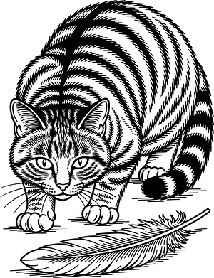 A playful feline captures the exact moment of a hunting leap, with four distinct paw pads visible on outstretched front legs and ears pointed forward in concentration on this coloring sheet. The feathered toy dangles from a string in the upper portion, its individual plume strands radiating outward from the attachment point. Directional fur lines flow along the cat's spine, chest, and tail, while the floor beneath displays a wood grain pattern that anchors the action scene. The cat's striped fur pattern needs contrasting tones to separate light and dark bands across the legs, face, and body. Try blending warm oranges and cool grays for tabby markings, or create a calico effect using patches of cream, black, and rust. The wood floor grain benefits from parallel pencil strokes in varying brown shades, while the feather toy might use blues, greens, or natural bird colors to stand out from the main subject.