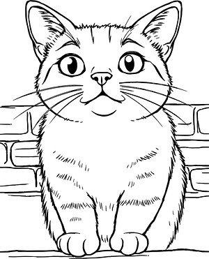 Large circular eyes anchor this feline portrait, with clearly outlined pupils and irises that beg for dramatic color choices. Pointed ears frame the top of the head with sharp triangular shapes, while six prominent whiskers radiate outward from each side of the face in graceful curves. The rectangular brick pattern behind creates a geometric contrast to the cat's soft, organic features. Those oversized eyes offer room for gradient work-try transitioning from light amber centers to deep green outer rings. The whiskers need careful coloring in white or light gray to stand out against whatever shade you choose for the fur, whether realistic tabby stripes or imaginative purple tones. Use rust, terracotta, or even rainbow hues for the individual bricks to create visual interest in the background without competing with the cat's expressive face.