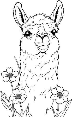 Fluffy wool covers this llama's neck and body in rounded cloud-like sections that create natural shading zones for this coloring page. Six-petaled wildflowers rise from the meadow floor at varying heights, some reaching up to the llama's shoulder while others cluster near its hooves. The animal's alert ears point upward, and its elongated neck curves gracefully as it gazes to the side with a calm expression. The wool sections need soft blending with colored pencils to capture their puffy texture-try layering creams, tans, and warm browns in circular motions. Each wildflower might use different color families: some in purples and pinks, others in yellows and oranges to create a diverse spring meadow. The open background behind the llama gives you space to add gradient skies or keep it simple with a single wash of blue or green.