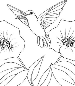 Wings stretched to full span capture the hummingbird frozen in its characteristic hovering position, with individual feathers radiating outward from the body like fine spokes for this coloring page. Two trumpet flowers face different directions-one tilts upward while the other angles to the side-each displaying deep, flared openings with visible interior petal ridges. Elongated leaves with prominent center veins curve around the scene, their pointed tips creating movement throughout the garden setting. Build texture in the feathered sections using soft strokes that follow each wing segment's natural direction-grays or iridescent greens capture ruby-throated varieties perfectly. Trumpet flowers come alive with vibrant coral, orange, or red tones, darkening deep inside each bloom where the bird feeds. Yellow-greens highlight sunlit leaf portions while deeper forest greens emphasize shadowed areas, adding dimension to this printable nature scene.