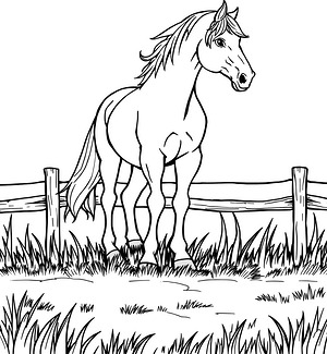 Curved muscle lines define the horse's neck, shoulder, and hindquarters, creating natural contours across its body in this printable coloring page. The mane cascades down in wavy sections, while the tail flows in similar sweeping strands that reach toward the ground. Three horizontal fence rails create a simple backdrop, with grass tufts sprouting between and around the posts. The horse's coat needs smooth blending to show its muscular form-try browns ranging from chestnut to deep mahogany, or experiment with grays from dappled silver to charcoal. Directional shading on the mane and tail adds movement and depth to these flowing sections. The fence wood could feature warm oak tones or weathered gray, while the meadow grass might use multiple green shades from spring lime to darker forest hues for a natural prairie feel.