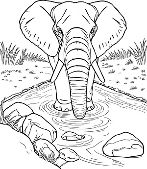 Curved trunk lines reach downward toward rippling water, creating a natural focal point where the elephant drinks for this coloring page. Layered skin folds wrap around the legs and trunk, giving dimension to the massive form. Circular rocks of varying sizes dot the riverbank, some partially submerged, while grass clumps fill the spaces between stones with upward-pointing blades. The elephant's textured hide needs subtle grays and warm earth tones to show age and character in those wrinkled areas. River water could shift from cool blues near the surface to deeper teals where shadows form, while the rocks might use charcoal, slate, or brown shades to create variety. Grass tufts along the bank take on yellows, browns, or spring greens depending on whether you picture dry savanna or wet season growth.