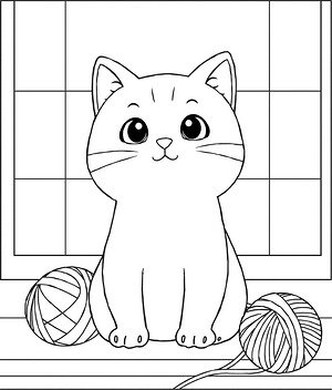 Oversized circular eyes dominate the cat's face, creating that signature kawaii look with large pupils and minimal detail in this coloring design. Three spherical yarn balls of varying sizes cluster together on the windowsill's surface, each wrapped with continuous curved lines suggesting wound thread. The window divides into four equal rectangular panes, with vertical and horizontal bars meeting at the center to create a classic grid pattern. The yarn balls need circular shading to show their rounded forms-try darker tones along the bottom curves and lighter highlights on top. Each section of the window frame could use different values to separate the inner edge from the outer frame, giving depth to the woodwork. The cat's simple shapes make testing gradients easy, especially moving from darker gray along the back to lighter tones on the chest and face.