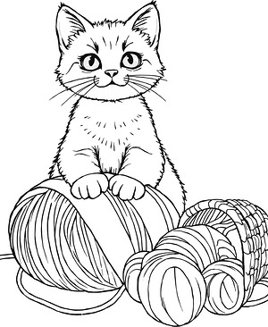 Yarn strands loop and wind in every direction, creating overlapping curves that weave between scattered balls and the seated kitten in this coloring page. Each yarn ball shows wrapped texture lines that circle around its spherical form, while the woven basket displays a crosshatch pattern of horizontal and vertical strands. The kitten's rounded face features large eyes, pointed ears, and a small nose, with its fluffy tail curving along its body. The yarn textures need consistent pencil pressure to show the wrapped thread effect convincingly. Try warm grays or tans for tabby stripes on the kitten's fur, then use bright jewel tones like magenta, turquoise, or golden yellow for different yarn balls to create eye-catching contrast. The basket might use natural browns with darker shading where the weave overlaps, while the background yarn strands could alternate between the same colors as the balls to show which strand connects to which.