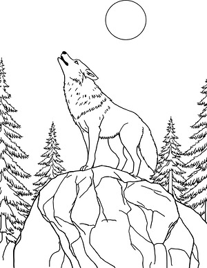 A wolf's muscular body stretches across the cliff top, with individual fur strands radiating from the neck and shoulders down the back and legs in this detailed coloring design. The moon sits perfectly centered behind the howling pose, creating a circular frame that contrasts with the angular rock ledges below. Pine trees cluster at different heights along the cliff base, their triangular shapes creating rhythm across the lower portion of this wildlife design. The fur texture needs directional shading that follows each section's natural flow-darker tones along the spine and lighter highlights on the chest and legs bring out dimension. Try midnight blues and purples for the sky around the moon, then shift to warm yellows or cool silver for the moon itself to create dramatic lighting. The rocky cliff takes well to gray layering with burnt sienna accents in the cracks, while the pine trees could range from deep forest green to almost black for nighttime atmosphere.
