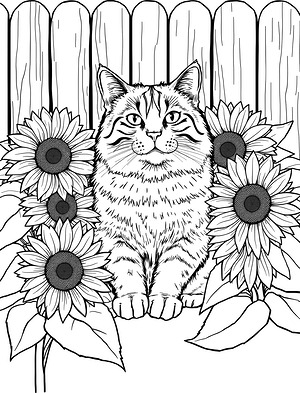 A fluffy Maine Coon occupies the center position, its fur rendered in flowing directional strokes that create volume around the chest, face, and body in this coloring page. Surrounding the feline, sunflower heads range from fully opened blooms displaying circular seed centers to partially visible flowers positioned at different angles. Stems and broad leaves fill the background spaces, creating layers that frame the cat's seated pose. The fur sections need careful pencil work to build realistic texture-try short strokes radiating outward from the face and longer sweeping lines down the chest and sides. Each sunflower head offers a chance to experiment with warm yellows, from butter tones in shadowed petals to bright lemon on sunlit edges, while the seed centers could use burnt umber or charcoal for depth. Consider using multiple green shades for the foliage, perhaps forest green for shadowed leaves and spring green where light would hit.