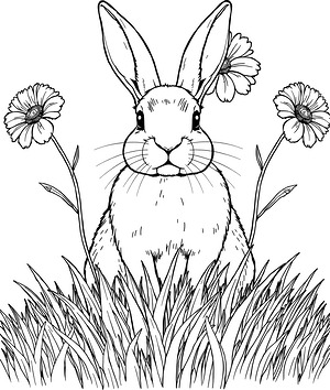 Directional fur lines sweep across the rabbit's body, creating texture from its alert ears down to its cottontail in this detailed coloring design. Wildflowers dot the meadow scene, each bloom showing individual petals radiating from round centers, while tall grass blades stretch upward between the stems. The rabbit's eye, whiskers, and nose provide focal points on its face, balanced against the botanical elements filling the surrounding space. The fur texture needs careful pencil strokes following each directional line to build realistic depth and volume. Try warm brown or gray tones for the rabbit, then contrast those earthy shades with bright yellows, purples, or pinks in the wildflowers. The grass stems could feature multiple green values-darker near the base and lighter toward the tips-to add dimension to this wildlife printable.