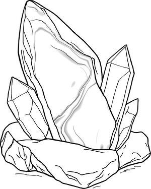A tall labradorite crystal with angular facets dominates the left side, its surface divided into distinct geometric planes that catch light differently in this printable coloring page. Multiple quartz points cluster on the right, each with hexagonal prisms tapering to sharp terminations. The rocky foundation beneath features irregular cracks, weathered edges, and natural stone texture that contrasts with the smooth crystal faces above. The labradorite's flat facet planes invite color layering to show iridescent flashes-try blues shifting into purples or greens with darker shading along the edges. Each quartz crystal could feature different clarity levels, from transparent with pale tints to milky whites with gray shadows in the facet grooves. The rough base texture needs broken, uneven tones in browns and grays to distinguish it from the polished crystal surfaces.