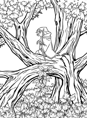 Twisted oak trunks frame both sides of this forest illustration, their heavily textured bark creating vertical patterns that contrast with the smooth fabric folds of the elf's garments in this printable coloring page. The staff extends nearly the full height of the page, connecting ground-level grasses to the canopy of leaves above. Each tree displays distinct knots and wood grain, while the overhead branches create organic archways through the composition. Bark textures need cross-hatching or stippling to show age and depth, while fabric draping benefits from gradient shading to show dimension. Try earthy browns and grays for the ancient oaks, then use jewel tones like emerald or sapphire for the elf's clothing to create visual separation from the natural surroundings. Wood grain runs lengthwise down the staff-apply directional strokes with colored pencils to follow those vertical lines.