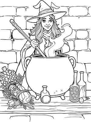 Cascading fabric folds form the witch's robe, creating vertical lines that flow from shoulders to floor in this coloring design. The workbench behind her holds an arrangement of cylindrical bottles, round flasks, and rectangular books stacked at different angles. Herb bundles hang with tied stems, their leafy tops spreading outward, while candle flames rise from holders of varying heights across the table surface. The witch's clothing needs deep purples or forest greens with darker shading in each fabric fold for dimension. Try amber and gold tones for the potion liquid inside the cauldron, contrasting with charcoal gray for the metal itself. The bottles could each feature different liquid colors-ruby red, emerald, sapphire blue-while the herb bundles might use sage, thyme, and basil greens mixed with dried brown stems.