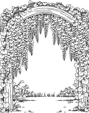 Cascading flower clusters hang in graduated lengths from twisted vines that wrap around a lattice arch framework for this coloring page. The wisteria blooms feature individual florets stacked vertically, creating elongated cone shapes that dangle freely throughout the composition. Diamond-patterned trellis sections form the underlying structure, with climbing stems weaving between the geometric openings and curving over the arch's rounded top. The hanging flower clusters benefit from gradient shading that starts light at the top and deepens toward the bottom of each bloom. Try purple and lavender tones for traditional wisteria, or experiment with white, pink, or blue variations for a creative twist. The lattice framework might use brown or weathered gray tones, while the twisting vines could feature multiple green shades to show depth where they overlap and intertwine.