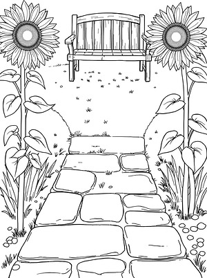 Massive sunflower heads dominate the upper portions of this garden scene, with radiating petals surrounding round center discs packed with seed patterns in this printable coloring page. Round stepping stones create a winding path that draws the eye through clustered stems and overlapping leaves. A slatted wooden bench positioned mid-scene adds a horizontal element against the vertical flower stalks. The sunflower centers need careful attention with colored pencils to capture the crosshatch seed texture, while the petals might use golden yellows, burnt oranges, or even unexpected purples for artistic variety. Try darker earth tones for the stone path to make it recede, then use bright greens with varied shading on the layered foliage to create depth between foreground and background plants. The bench slats benefit from wood grain strokes in browns or weathered grays to add realistic detail.