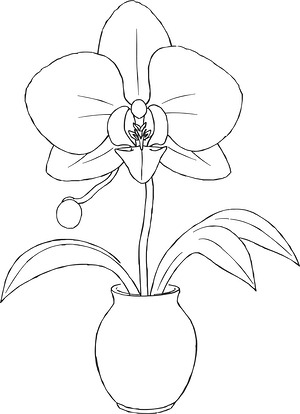 One graceful orchid stem rises from a compact vase, showcasing a single bloom with three symmetrical outer petals and an elaborate ruffled center for this coloring page. The plant's two leaves spread horizontally at the base, featuring prominent central veins that branch into smaller side veins. The rounded vase provides a stable foundation, its curved body contrasting with the organic shapes of the flower and foliage above. The orchid's layered center section needs careful color choices to emphasize its ruffled texture-try darker purples or pinks against lighter outer petals in white or pale lavender. The leaf veins create natural guides for shading with multiple green tones, from deep forest along the veins to lighter lime toward the edges. Consider a ceramic appearance for the vase using soft grays with subtle highlights to suggest a glossy finish.