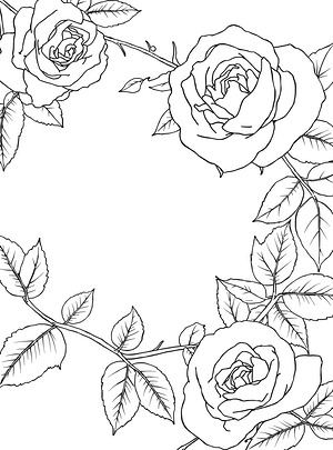 Corner roses bloom with multiple petal layers that spiral outward, each measuring roughly three inches across for this coloring page. Smooth-edged leaves with visible center veins branch off from curved vines that connect all four corners, creating the rectangular border structure. The blank interior space takes up approximately sixty percent of the page, surrounded by this botanical frame. Each rose corner becomes a focal point for gradient shading from pale centers to darker outer petals-try pink to magenta or yellow to coral transitions. The leaves need consistent midrib shading to show dimension, while the connecting vines work as neutral elements in brown or deep green. Shading under overlapping leaves where they cross the vines adds depth to this frame design.