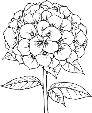 Two large hydrangea blooms fill the page, their rounded forms constructed from dozens of small four-petaled flowers packed together in this coloring page. Broad leaves spread outward with deep veining that branches from each central midrib toward the wavy, scalloped outer edges. Thick stems connect the various elements, supporting both the heavy flower clusters and the substantial foliage in a natural growing pattern. Each tiny four-petaled flower within the clusters gives you space to practice gradual color shifts-start pale at the center of each small bloom and deepen the tone toward the petal tips. The pronounced veins running through each leaf create natural dividing lines where you might blend two shades of green, using lighter tones directly on the vein paths and darker hues in the spaces between. Small circular centers dot each miniature flower, offering spots for contrasting yellows or creams against whatever pink, lavender, or blue you choose for the petals.