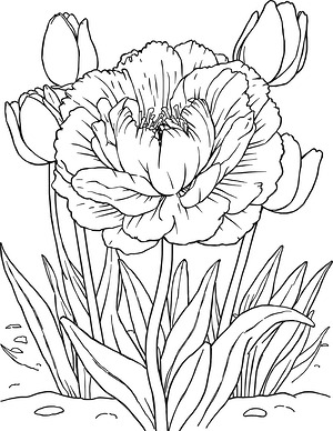 Overlapping peony petals with wavy edges create depth in the upper blooms, each layer slightly offset from the one beneath it in this coloring design. Below, tulip flowers display their classic cup shape with individual petals clearly defined, while long leaves arch and curve between the stems. The botanical arrangement mixes closed tulip buds with fully opened peonies, showing different stages of bloom in one garden patch. Ruffled peony edges need careful blending to show their soft, tissue-like quality-try gradual shading from pale centers to darker outer edges. Bold magenta or coral might fill tulip petals, standing out against softer pinks or whites you could use for peonies. Long leaf shapes give you room to build gradients, moving from deep forest green at the base to lighter yellow-green at the tips.