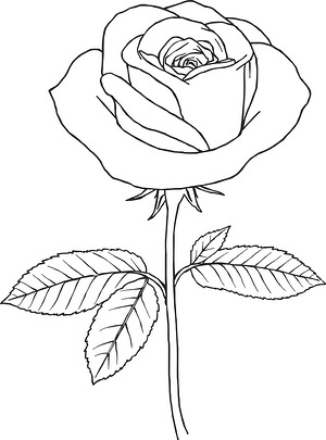 This pressed-flower illustration presents a rose as seen from directly above, capturing the botanical specimen aesthetic of traditional herbarium collections in this printable coloring page. Overlapping petals radiate from the central point in carefully arranged layers, each petal curved at the edges to suggest natural dimension despite the flattened format. The straight stem descends from the flower head with two opposing leaves that show visible veining patterns and gently pointed tips. The layered petal structure invites gradual shading techniques, building darker tones at each petal's base where they tuck beneath neighboring layers while keeping edges lighter. Try warm peach or coral hues that deepen to burgundy toward the center, or experiment with classic red rose tones that shift from crimson to deep maroon. The leaves could feature multiple green shades-perhaps sage on one side of each vein and forest green on the other-to create realistic botanical depth in this scientific-st