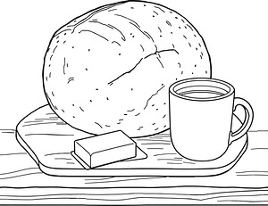 Round crosshatch scoring marks divide the loaf's domed top into diamond sections, while horizontal and vertical grain lines run through the wooden board beneath in this coloring page. Rectangular butter portions show a grid pattern pressed into their surfaces, and smooth oval slices of bread lie at different angles across the composition. The coffee mug features a curved handle and cylindrical body positioned beside the bread display. The scored bread top needs careful blending between light and shadow to show its curved surface, while the wood grain direction creates natural movement across the board. Try warm ochres and golds for the bread crust, transitioning to pale cream tones for the soft interior of each slice. The butter's grid texture benefits from subtle shading to create depth without losing the pattern definition, and you might use cooler tones for the ceramic mug to contrast with the warm bakery items.