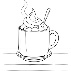 Steam wisps spiral upward from whipped cream piled high above the mug's rim, creating flowing curves that contrast with the straight cylindrical shape below for this coloring page. Three rounded marshmallows dot the cream's surface, their circular forms adding geometric variety to the scene. The spoon positioned alongside features a wide bowl and handle that balance the vertical mug structure. The whipped cream texture needs careful blending-try light circular strokes with colored pencils to build soft volume and shadows. The mug itself could feature warm browns, deep reds, or classic café ceramics in cream and blue patterns. Steam areas work best with pale grays or soft blues to create that translucent vapor effect against whatever background tone you choose.