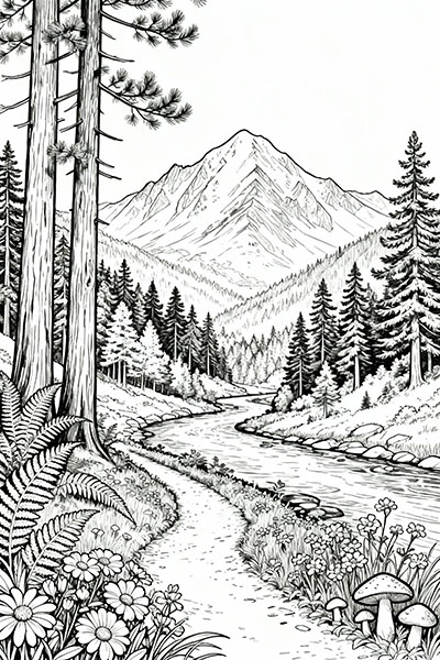 Quiet mountains, pine forests, rivers and open skies - timeless outdoor scenes for anyone who enjoys calm, scenic coloring.