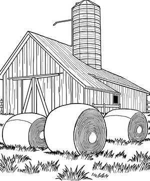 Vertical wood planks run the full height of the barn's facade, creating parallel lines that contrast with the smooth curved surface of the adjoining silo for this coloring page. The cylindrical grain tower features horizontal bands near its domed top, while rectangular windows punctuate both structures at different levels. Round hay bales with radiating texture lines sit at varied positions across the farmyard, their circular forms standing out against the angular buildings behind them. The barn's weathered wood siding needs brown or gray pencil strokes to bring out its aged character, while the silo might use cool concrete tones or even rusty metal shades for variety. Try golden yellows and tans for the hay bales, adding darker shadows where they touch the ground to create dimension. The fence posts and rails could feature darker stains or natural wood grain patterns that help anchor the scene.