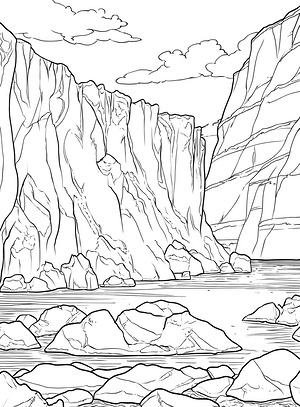 Jagged cracks split the glacier wall into irregular polygonal sections, creating a natural puzzle of ice fragments on this coloring sheet. Dark crevasses cut diagonally and vertically across the surface, with some fissures appearing deep while others remain shallow grooves. Floating ice chunks of different sizes cluster near the waterline, their angular edges contrasting with the rippled water surface beneath them. The fractured sections need different values to create depth-try darker blues and grays in the deep cracks while keeping the ice faces lighter with hints of white or pale cyan. Water areas benefit from horizontal shading that suggests movement, using navy or teal tones that darken toward the bottom. The floating ice pieces could feature cooler highlights on their top surfaces to show how light hits each chunk differently.