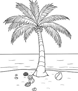 A textured palm trunk rises vertically with horizontal line markings that wrap around its cylindrical form, while fan-shaped fronds spread out in all directions from the crown for this coloring page. Individual seashells display different patterns-some show ridged lines radiating from a center point, others feature spiral coils that curve inward, and larger shells have smooth curved surfaces with natural opening shapes. The sandy ground beneath uses small circular and irregular shapes to create beach texture, while rolling wave lines in the back create horizontal movement across the scene. The palm fronds benefit from gradient shading that darkens from the outer tips toward the trunk connection point, creating dimension in each blade. Try warm browns and tans for the trunk's textured bark, then contrast those earth tones with bright tropical blues and greens in the water and foliage. Each shell type needs a different approach-use soft peach or cream for smooth surfaces, while the ridg