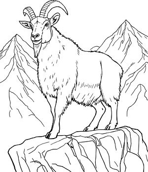 Curved horns rise from the goat's head while dense fur covers its neck and shoulders in directional strokes that flow downward in this detailed coloring design. Angular boulders create the summit platform beneath the animal's hooves, each rock face showing distinct edges and planes. Behind the goat, multiple mountain ridges stack in layers from foreground to horizon, their jagged peaks forming a dramatic alpine backdrop. The fur texture needs patient shading to build up volume-try using short pencil strokes that follow the hair direction from the neck down through the body. Rocky surfaces might use grays and browns with darker tones in the crevices between stones. Consider making the distant mountains lighter than the foreground peaks to create atmospheric depth in this alpine scene.