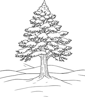 Horizontal branch tiers stack upward in a classic conifer silhouette, each limb supporting a substantial cushion of accumulated snow in this detailed coloring design. The needle clusters underneath each snow cap form distinct linear patterns that radiate outward from the central trunk. Curved snow drifts at ground level mirror the rounded shapes above, with flowing contour lines that suggest windblown accumulation. The snow masses need soft blues and grays to show dimension-try pale cerulean in shadowed areas and leave some sections white for brightness. The exposed needles benefit from layering dark forest green with touches of blue-green for cold winter tones. The smooth, flowing drift lines contrast with the textured needle sections, giving you two different approaches in one printable design.