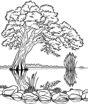 A towering pine with detailed branch layers stretches from ground to top, its pointed crown reaching skyward while its exact twin appears upside-down in the glassy water surface in this detailed coloring design. Reed clusters spread across the lower shoreline in varying densities, their straight vertical stalks creating rhythmic patterns. Rounded boulders of different sizes nestle among the reeds, each stone showing smooth contours that contrast with the angular pine needles. Needle clusters covering each branch need fine pencil strokes radiating outward, while the lake's reflection requires matching those same tones upside-down for a realistic mirror effect. Try using gradient shading on the rocks, starting darker where they meet the ground and lighter on top where sunlight hits. For the reed sections, use parallel line techniques-keep each blade straight while varying the pressure to suggest depth and distance.