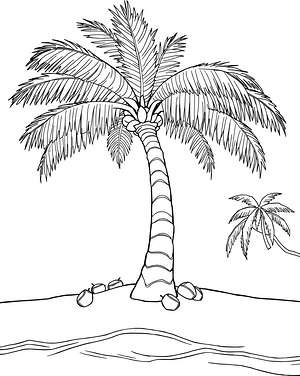 A sweeping palm trunk curves dramatically across the page, its textured bark marked by horizontal rings and vertical grooves in this printable coloring page. Five large fronds fan out at the crown, each displaying parallel lines radiating from center ribs to create feather-like patterns. The ocean background consists of multiple wave bands stacked horizontally, while the sandy foreground features undulating lines that suggest windblown dunes. The palm bark's crosshatch pattern needs careful attention with browns and grays to show dimension as the trunk curves through space. Try blending blues and greens in gradient layers for the waves, making distant ones lighter than those closest to shore. The fronds become an excellent practice area for directional strokes, where each segment could shift from deep forest green at the base to bright lime at the tips.