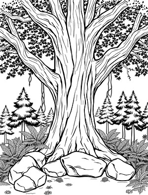 Massive tree trunks rise vertically through the composition, their bark showing distinctive curved grain patterns that follow the natural wood texture in this printable coloring page. Fern fronds unfurl in fan-like arrangements at ground level, each leaflet drawn as a separate segment branching from central stems. The winding pathway creates depth as it curves between mossy boulders marked with contour lines that suggest their rounded, weathered surfaces. The bark's flowing grain lines need consistent directional strokes to build realistic wood texture-try browns layered from tan to dark umber for dimension. Consider pale blues and grays for the background mist to contrast with richer forest floor greens in the ferns. The rocks benefit from gradual tonal shifts using the contour lines as shading guides, perhaps in cool stone grays or warm earth tones covered in green-tinted moss.
