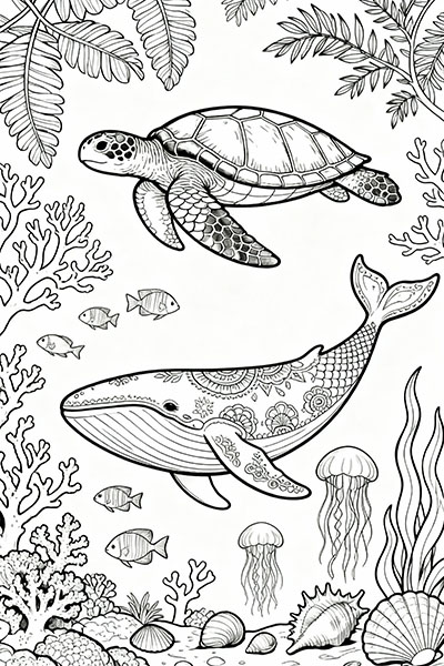 Sea turtles, dolphins, whales, coral reefs and ocean waves captured with a calm flow that feels peaceful to color.