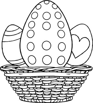 A woven basket with cross-hatch texture holds six decorated eggs, each displaying different surface patterns in this coloring page. Round polka dots of varying sizes cover some eggs, while parallel horizontal stripes wrap around others, and heart motifs create repeating designs on the remaining eggs. The basket's lattice weave forms consistent diamond shapes across its curved surface, providing a textured backdrop for the smooth egg forms. Different pattern densities across the eggs create natural color-blocking zones-dense polka dots might use bright pastels while wider stripes could feature bold hues like purple or teal. The basket weave needs careful directional shading to show depth where strands cross over and under each other. Try contrasting the eggs against a darker basket tone, or reverse it with pale wicker and vibrant egg colors for a spring-fresh printable design.