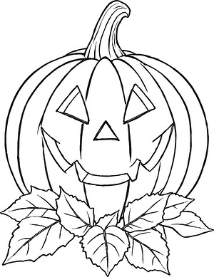 Triangular eyes sit above a grinning mouth that stretches wide across the pumpkin's face, revealing individual square teeth along the bottom edge for this coloring page. The carved pumpkin's rounded ridges curve from top to bottom, creating natural sections that define its shape. Surrounding maple leaves show pointed lobes and oak leaves display their characteristic wavy edges, scattered at different angles throughout the composition. The pumpkin's segmented surface invites shading techniques that follow each vertical ridge, building dimension with darker tones in the valleys between sections. Try vibrant oranges blended with touches of red or yellow on different segments to create a glowing effect, while the leaves might feature burnt sienna, golden yellow, and deep burgundy for autumn variety. The teeth inside the carved mouth could use cream or pale yellow against darker shading to emphasize the hollow interior.
