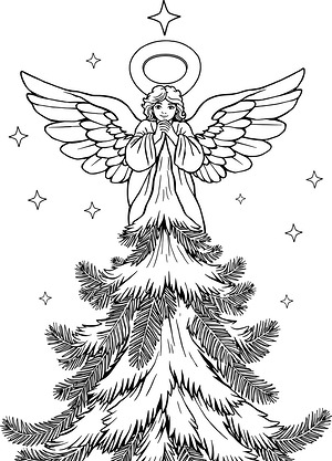 Feathered wings extend outward in symmetrical arcs, each feather rendered as a separate curved segment that radiates from the wing's base for this coloring page. The angel's robes cascade downward in smooth folds that create natural shading zones, while the face maintains simple, serene features. Pine needle clusters appear as spiky bursts beneath the figure, their linear texture contrasting with the rounded wing shapes above. The wing feathers need gradual value shifts to create dimension-try darker tones at the base transitioning to lighter tips on each individual feather. Metallic gold or yellow hues bring the halo to life, while the robes could use soft blues, creams, or traditional white with gray shading in the fabric creases. Forest greens mixed with darker pine tones give the branches natural depth, making the angel appear to glow against the evergreen backdrop.