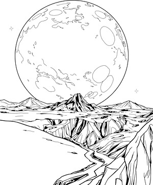 Venus dominates the left portion of this space illustration, its surface marked by overlapping circular craters of varying sizes and irregular formations that create a distinctive lunar-like texture in this detailed coloring design. The volcanic plain behind features parallel ridgelines and wave-like geological patterns that suggest ancient lava flows, while scattered stars of different sizes fill the cosmic backdrop. Crater rims cast shadows that add dimensional quality to the planetary surface. The planet's cratered surface needs careful shading to distinguish each circular depression from its neighbors-try using darker tones along crater edges to create depth. Consider warm yellows and oranges for Venus itself to reflect its actual atmospheric colors, while the volcanic plain could use burnt siennas or deep grays to show the ancient rock formations. The starfield background might work best with a dark blue or purple base rather than pure black, which helps the white stars stand out